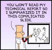 One of the most important skill young scholars must develop is the ability to give a technical presentation to a non-specialist audience. Everyone likes to strut his stuff but dissertation committee members, prospective academic employers, seminar audiences in various contexts, and others to whom you expose your work don’t necessarily want the gory details. Background, context, motivation, results, and implications are usually the most important parts of a presentation, but often the most neglected.