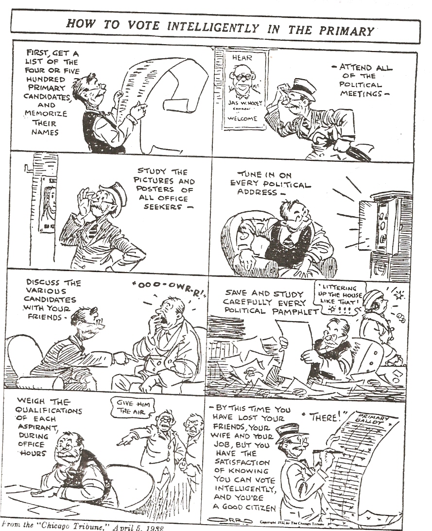 Cliff sent me a couple of amusing items on People Who Don’t Get It. Here’s one on a young Chicago woman who can’t decide between McCain and Obama, and is “probably going to cram the night before the election and really study them both.” Gee, I wonder which candidate is going to win Illinois? And here’s a wonderful cartoon from the 1932 Chicago Tribune, “How to Vote Intelligently in the Primary.” Ah, where are the Colonel McCormicks of today?