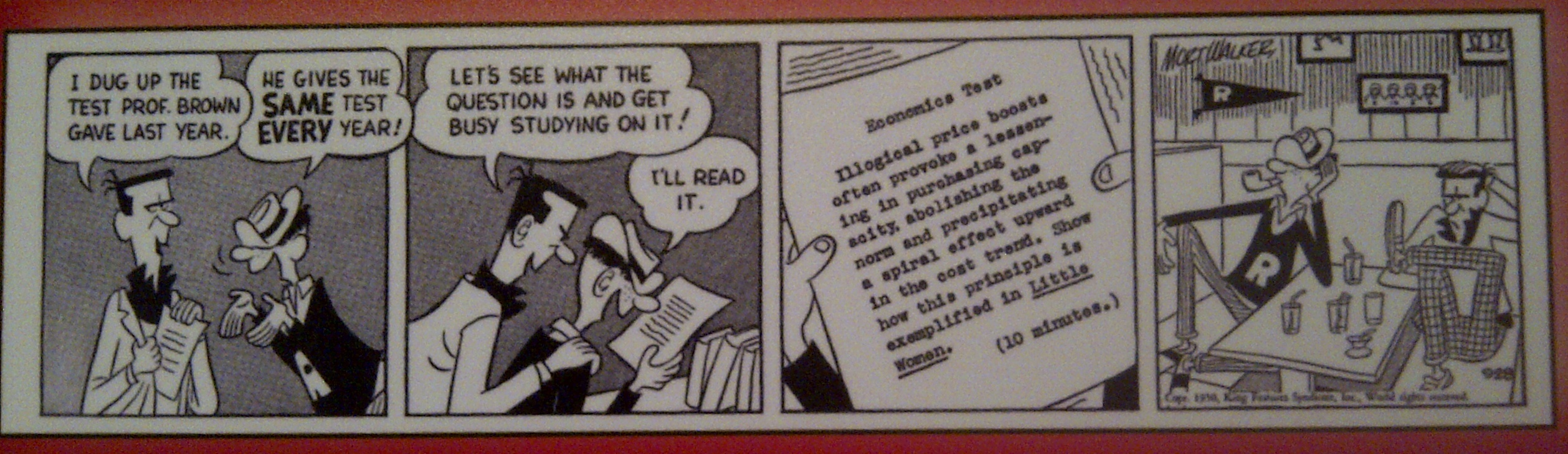 The University of Missouri’s sprawling new student center recently opened Mort’s, a reproduction of an old campus hangout called The Shack, made famous by Beetle Bailey creator and Mizzou alumnus Mort Walker. I snapped the photos below from the entrance to Mort’s, which is full of old Walker cartoons. I spied a 1950 cartoon featuring an economics test. Click to enlarge the strip.