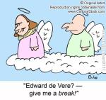 An English professor friend told me that belief in a different author for any of Shakespeare’s works is like “belief in the phlogiston theory of fire.” Stephen Marche writes in the NY Times Magazine: “It is impossible that Edward de Vere wrote Shakespeare. Notice that I am not saying improbable; it is impossible.” Again, I don’t know anything about the issue other than what I’ve read in recent commentaries, but Marche’s case, in the piece linked above, is surprisingly weak (some Shakespeare products are dated after de Vere died, which only proves that de Vere couldn’t have written those; the doubters are snobs who don’t believe a poor country boy could have written such beautiful verse, which could be true, but hardly establishes that the country boy did in fact write them; and other circumstantial bits and ex cathedra pronouncements.)