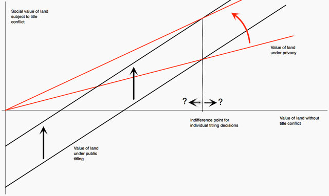 These challenges represent the costs of introducing ICTs in registries. In the book the benefits of ICTs for abating the costs of titling/recording are not discussed at length. Think of them in terms of the costs of gathering, entering, storing, organising and searching the data. I assume it is trivial to say that ICTs decrease the fixed and variable costs of registries even when some issues raised in the book are considered. In terms of the figure below (my elaboration of figure 5.1 on pg 133) this is equivalent to say that, thanks to ICTs, the black line representing the “Value of land under public titling” shifts upwards and therefore the “Indifference point for individual titling decisions” shifts leftward and makes registries more desirable.