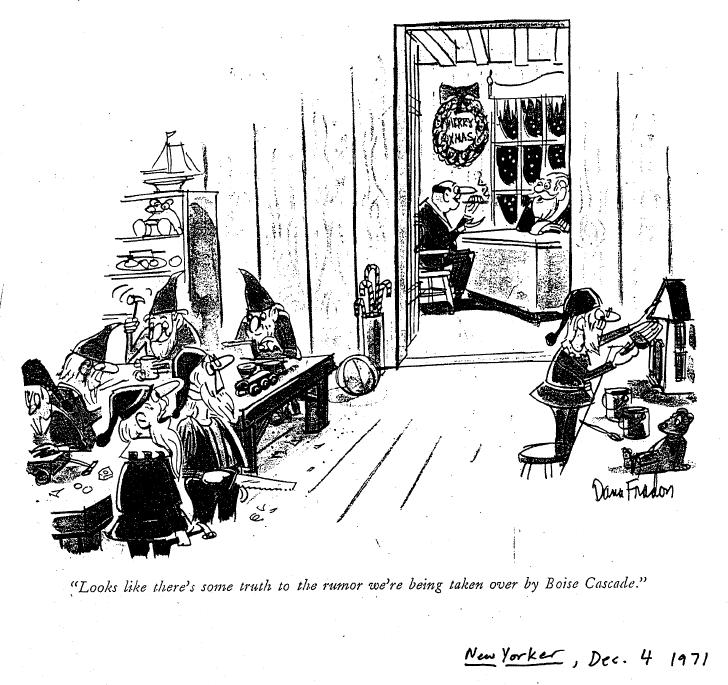 A funny (to me) New Yorker cartoon about diversification, appearing at the height of the conglomerate merger wave of the late 1960s and early 1970s. Click to enlarge. (I’ve been looking for this for a while; found it when cleaning out an old file cabinet.)